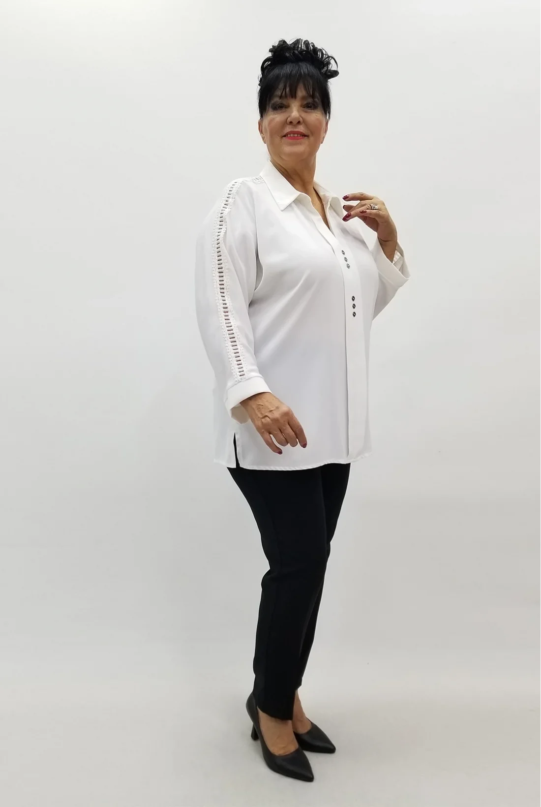 Gömlek yaka, güpür detaylı yandan yırtmaçlı jesica kumaş bluz (Tam kalıptır, tam bedeninizi tercih edebilirsiniz, likralı değildir.)