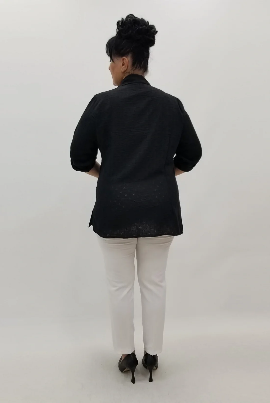 Gömlek yaka, yandan yırtmaçlı, kol katlamalı keten kumaş bluz (Tam kalıptır, likralı değildir.)
