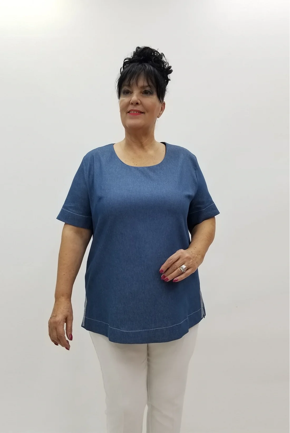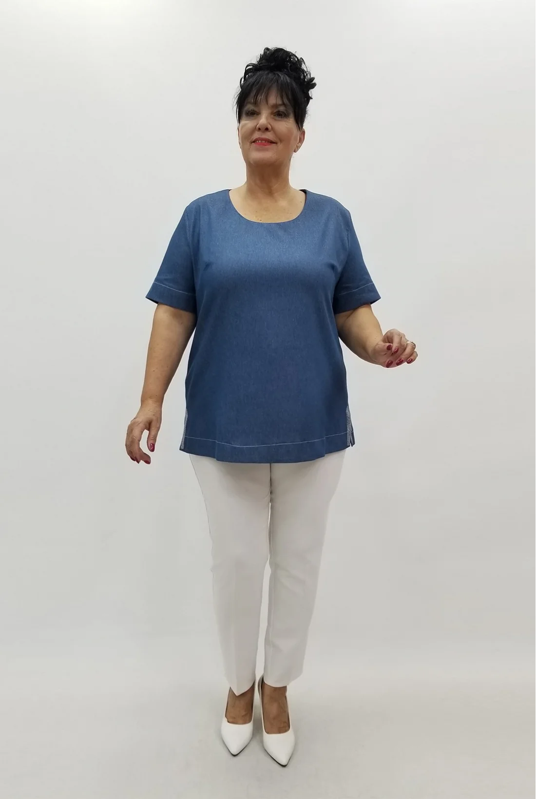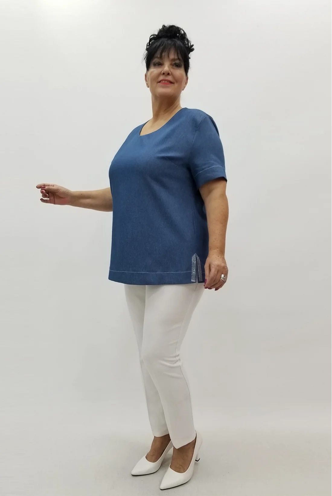 Etek ucu taşlarla işlenmiş, yandan yırtmaçlı pamuklu dokuma tensel kumaş bluz (Tam kalıptır, tam bedeninizi tercih edebilirsiniz.)