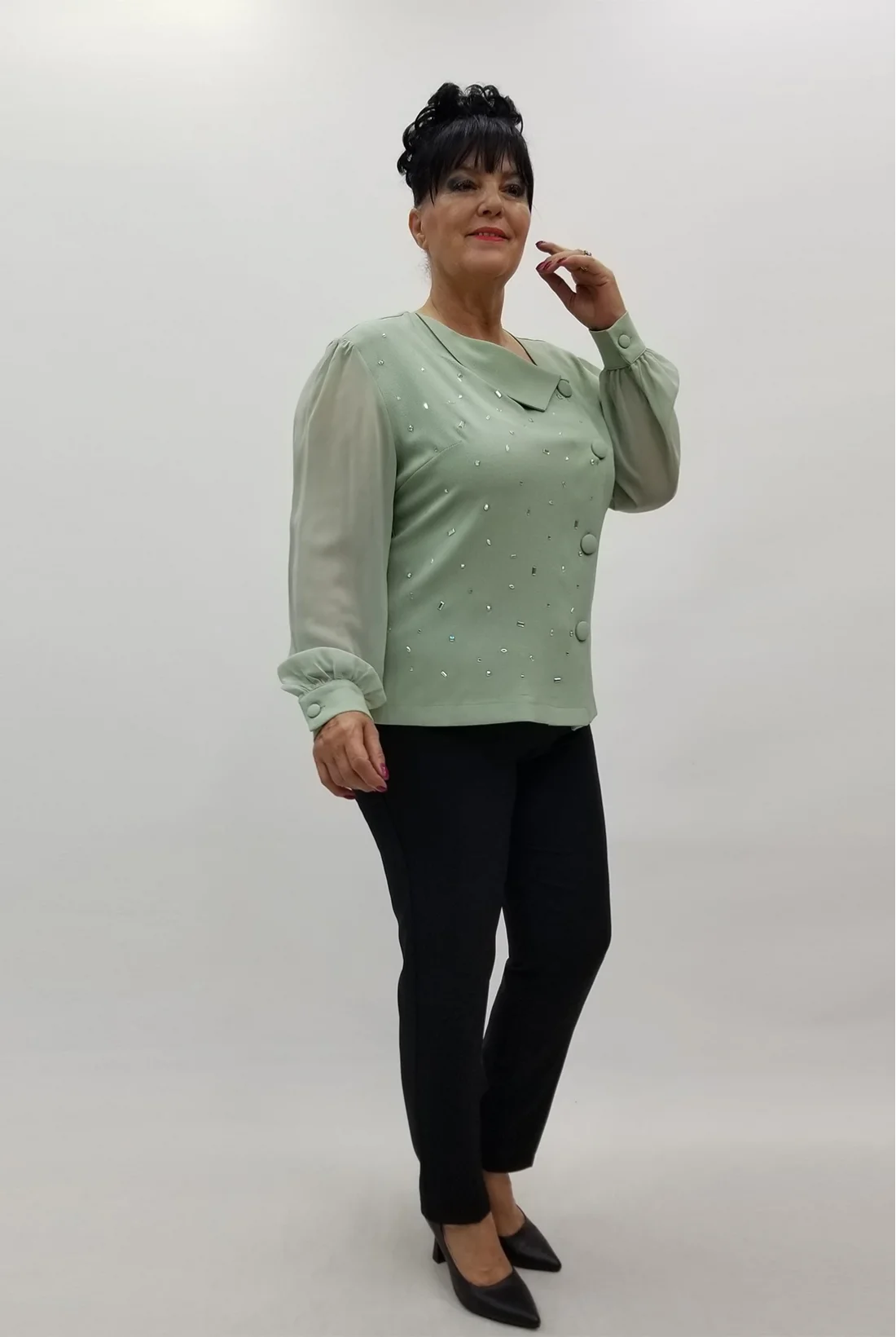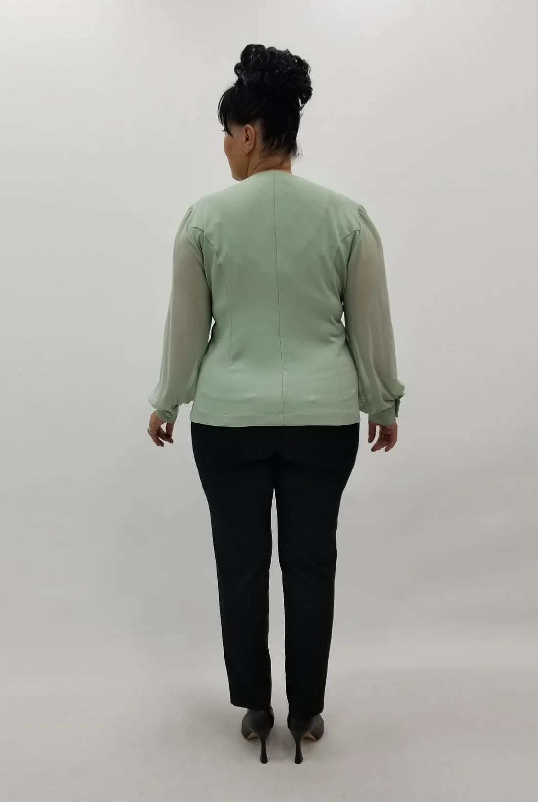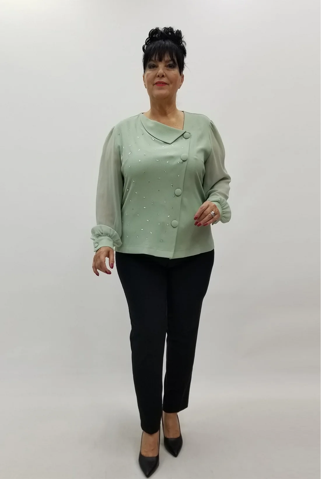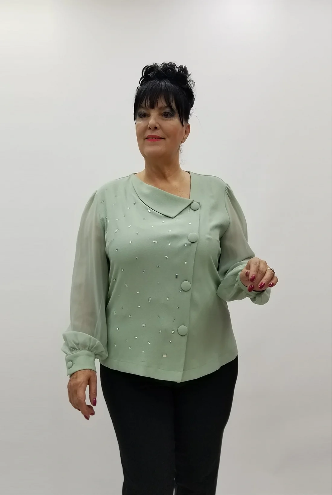Kolları şifon kumaş, önden düğmeli ceket görünümlü krep kumaş bluz (Tam kalıptır, likralı değildir.)