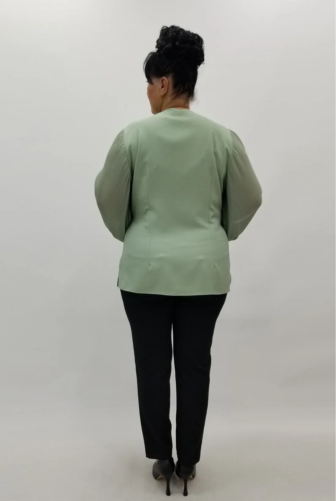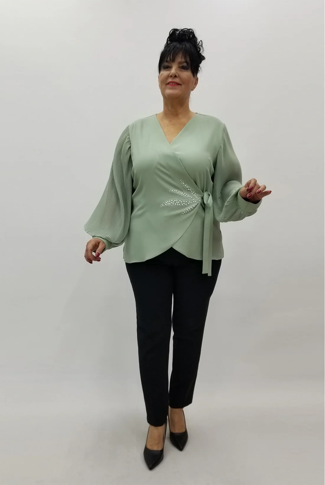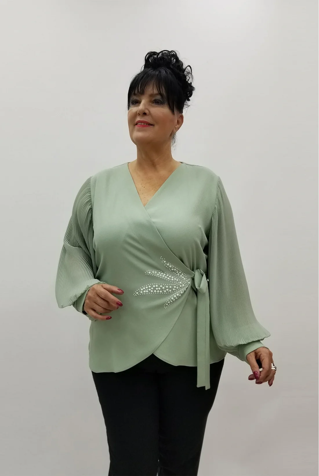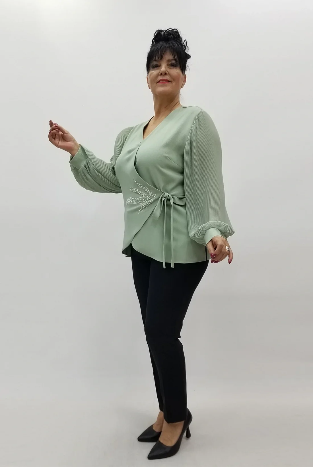 Kolları şifon kumaş, kruvaze yaka, yandan bağlamalı krep kumaş bluz (Tam kalıptır, likralı değildir.)