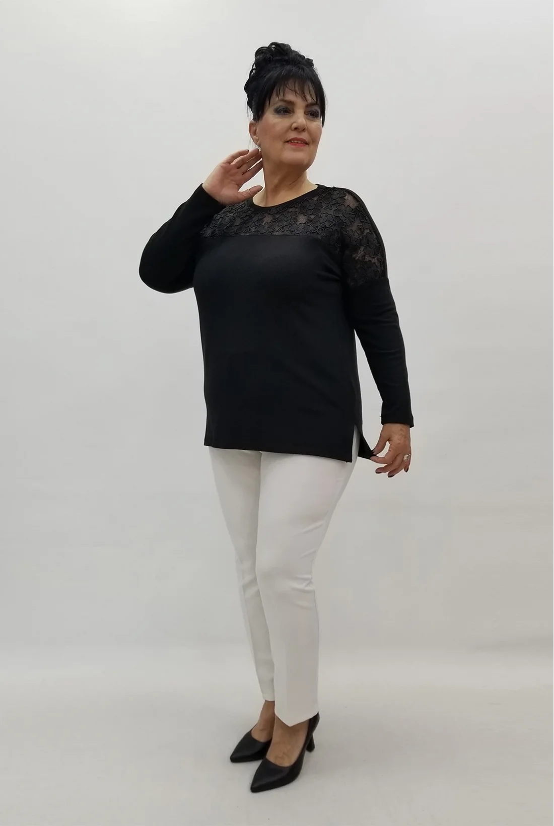 Yaka kısmı tül, likralı triko bluz. (Tam kalıptır.)