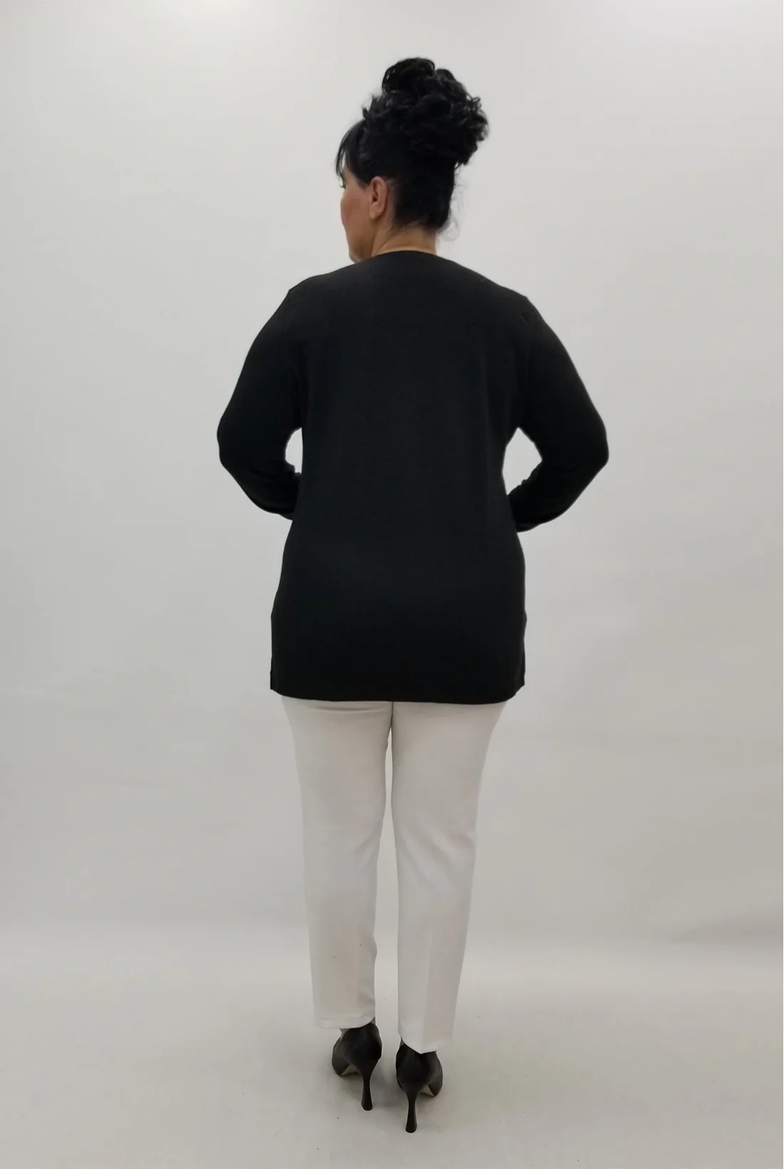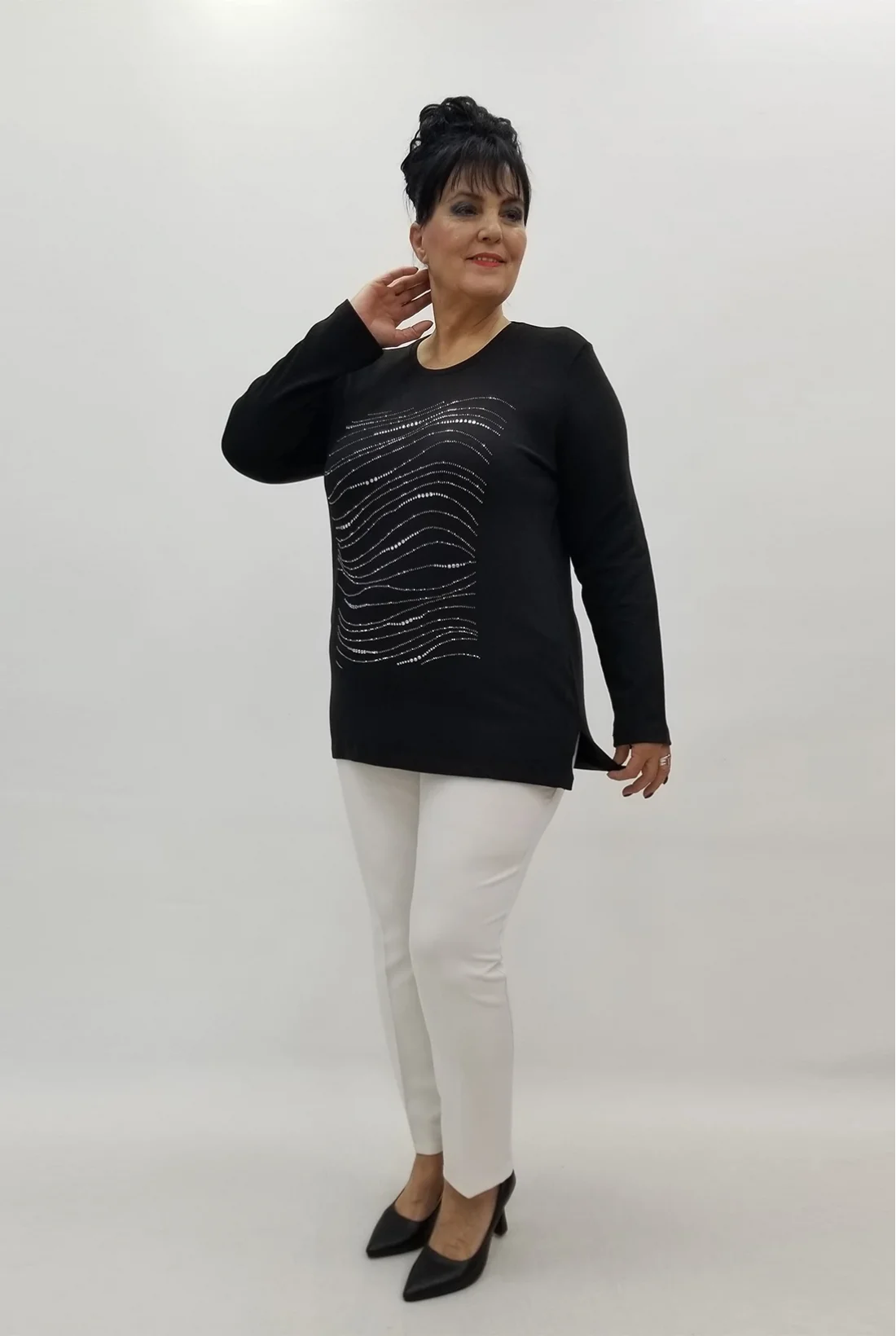 Ön kısmı taşlarla işlenmiş likralı triko bluz. (Tam kalıptır, tam bedeninizi tercih edebilirsiniz.)