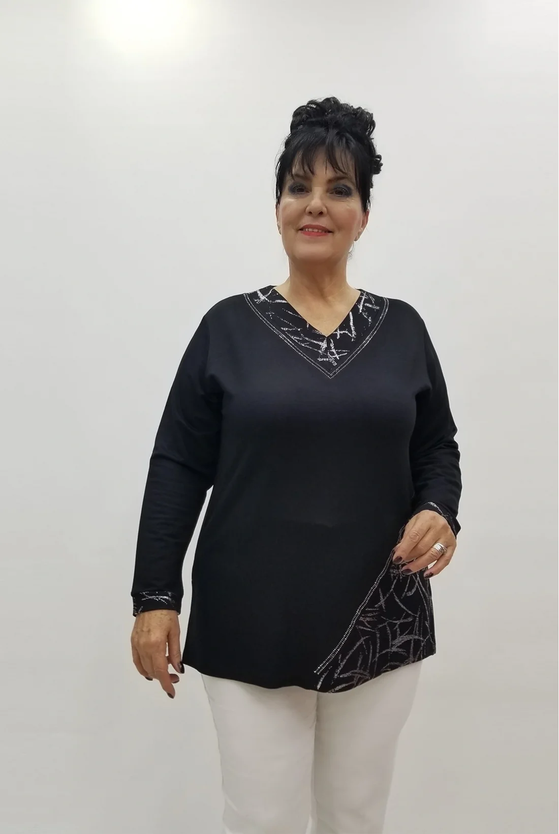 Yandan yırtmaçlı gümüş varaklı likralı iki iplik bluz (Tam kalıptır.)