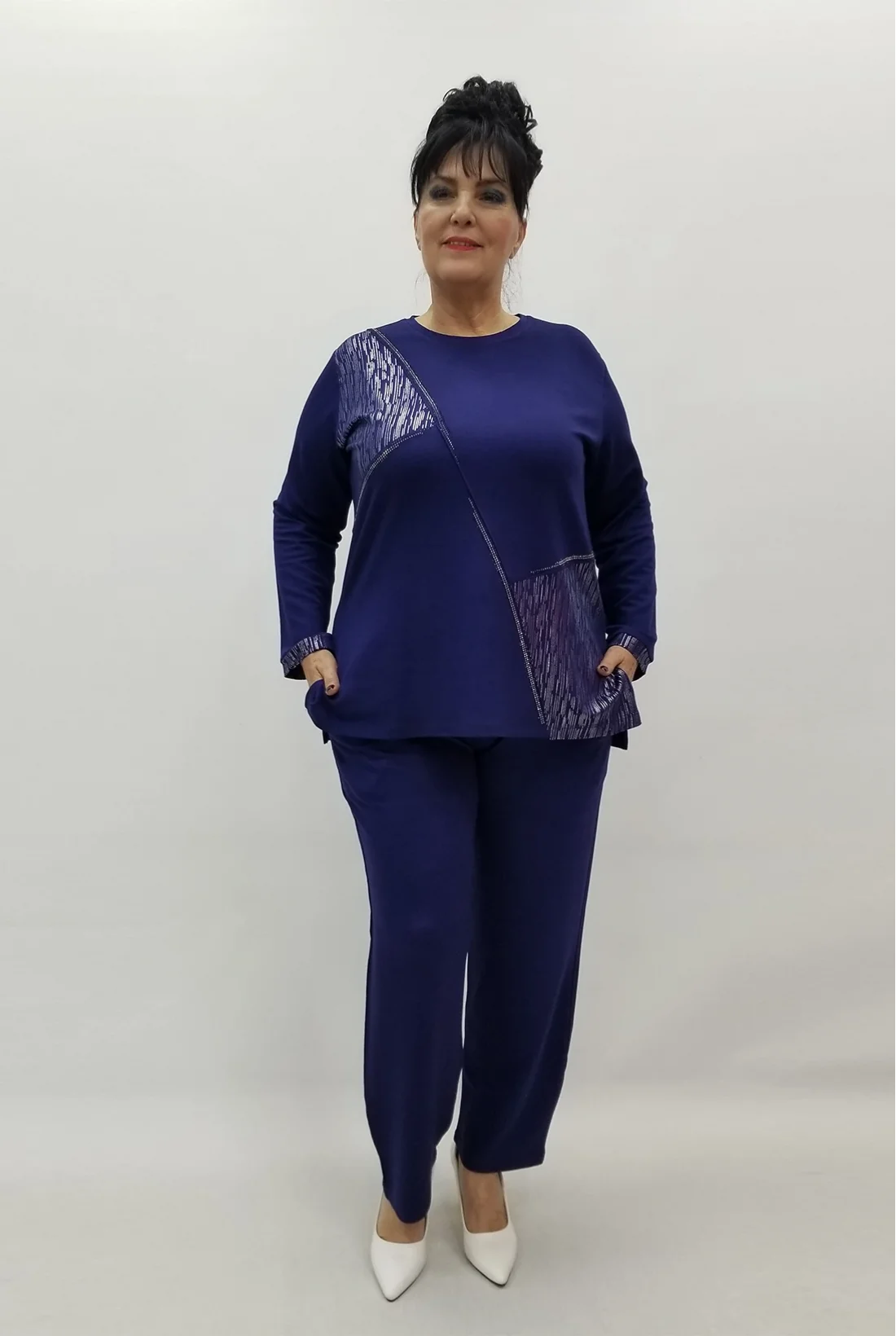 Yandan yırtmaçlı gümüş varaklı likralı iki iplik bluz (Tam kalıptır.)