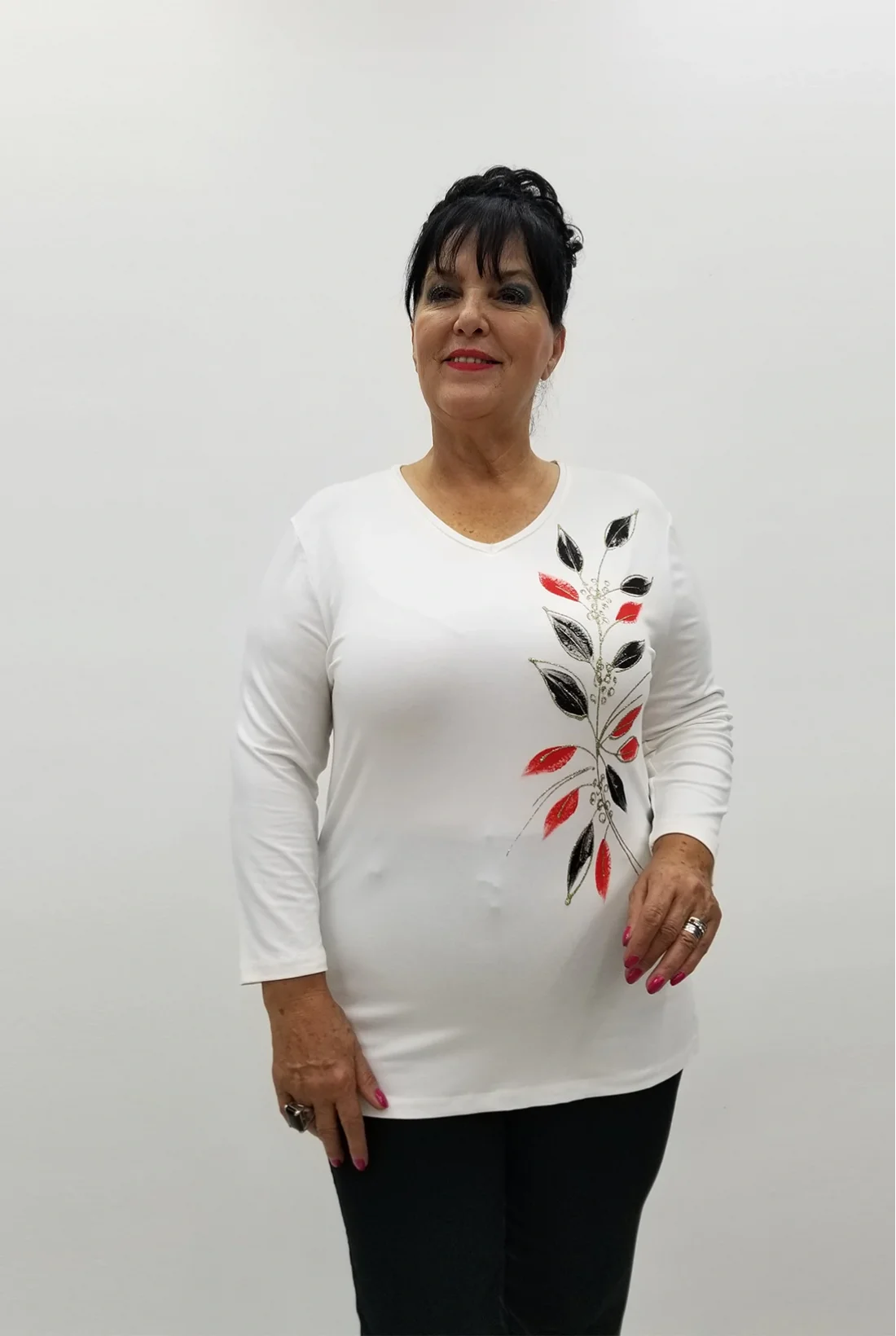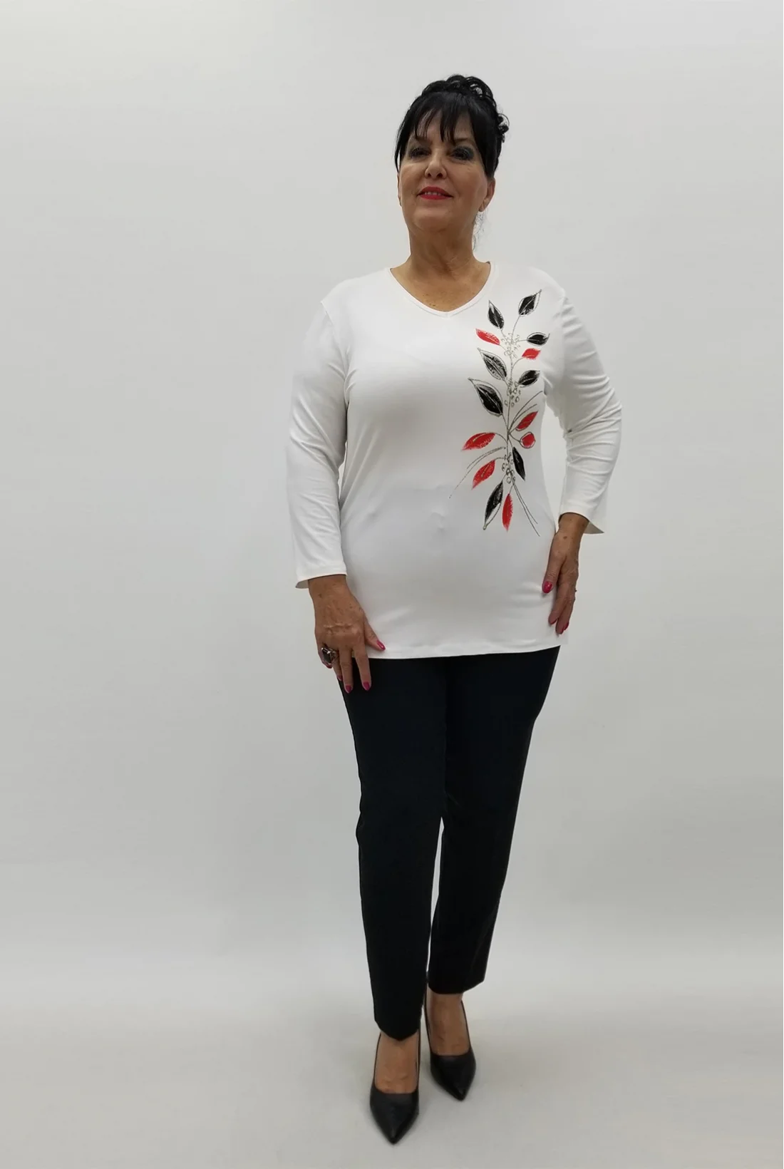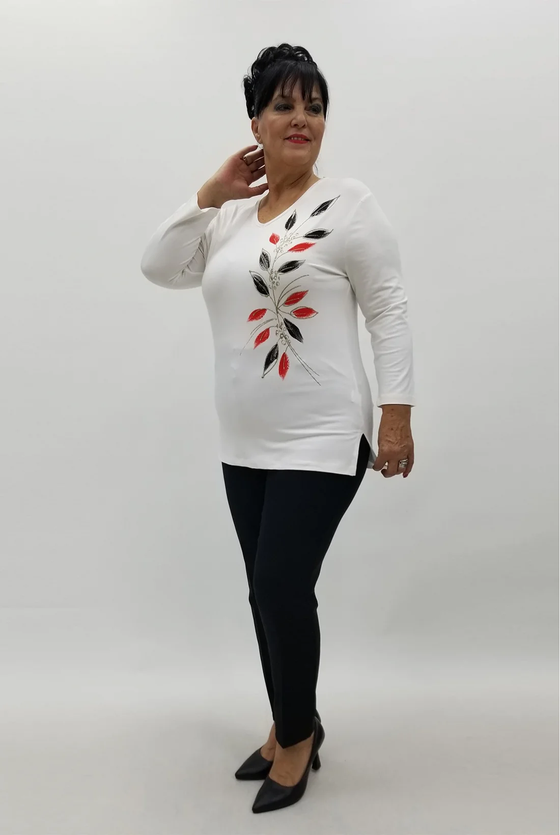 Yandan yırtmaçlı, ön kısmı varak baskılı, truvakar kol likralı viskon kumaş bluz (Tam kalıptır.)