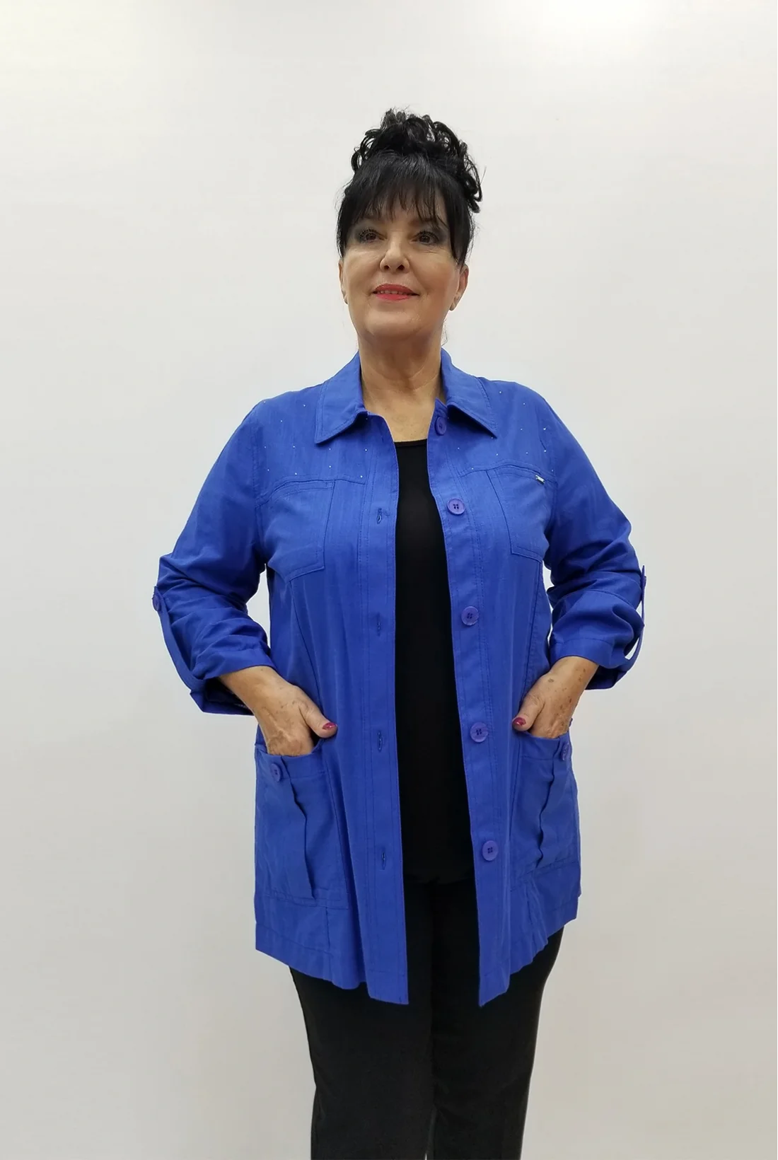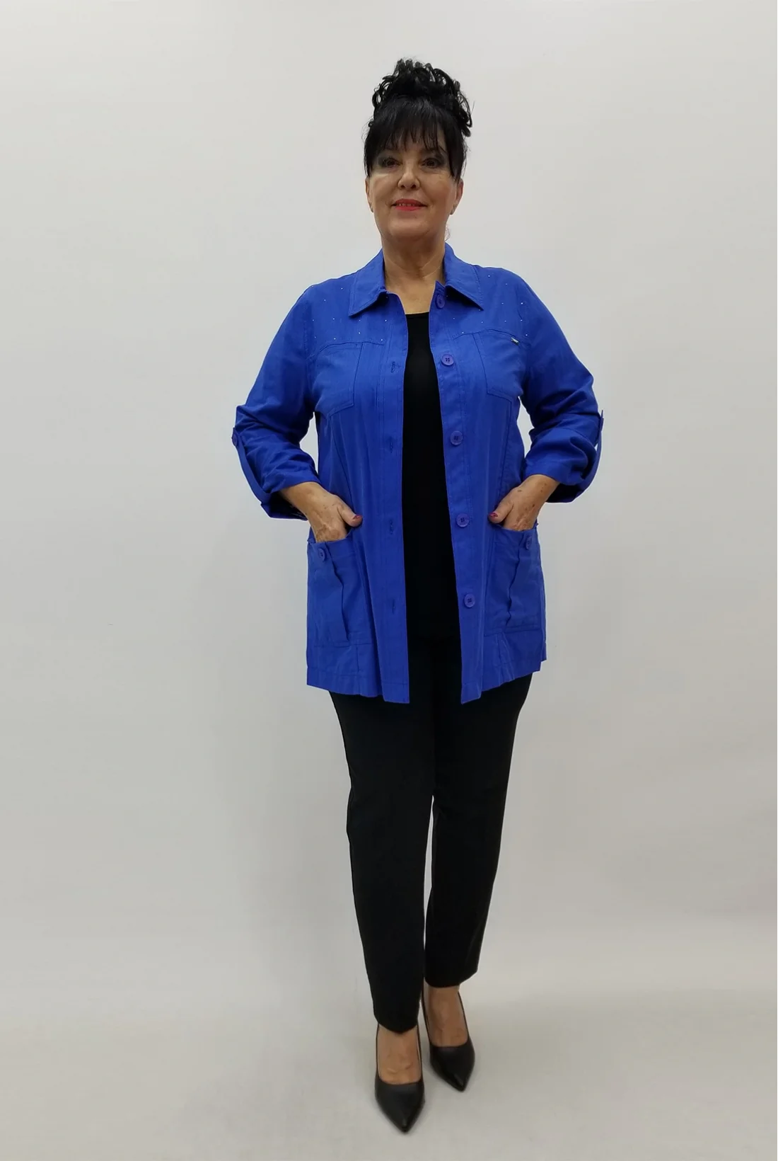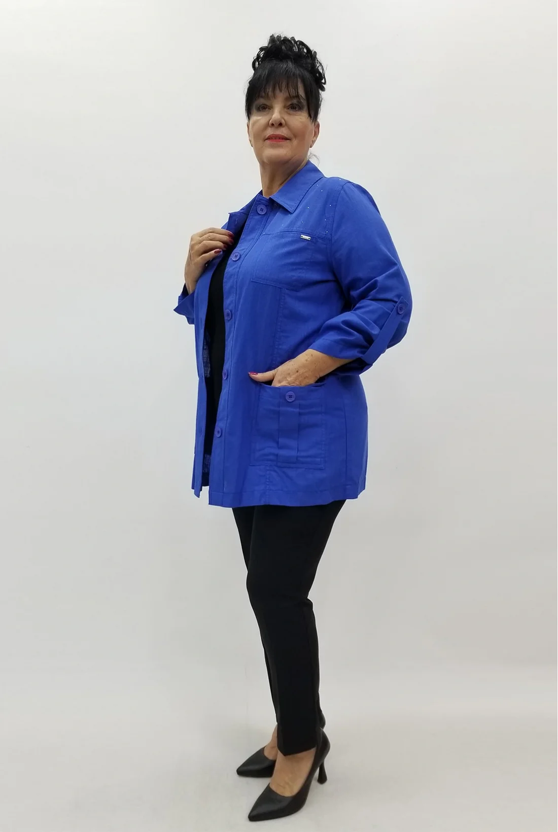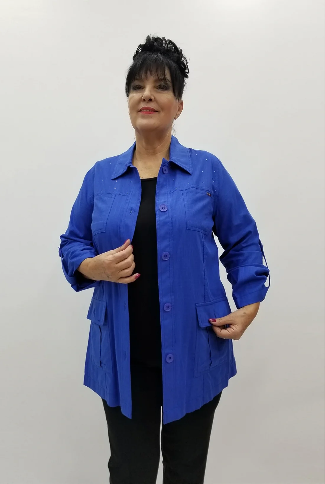 Yakası taşlarla işlenmiş, cepli keten kumaş ceket (Tam kalıptır, likralı değildir.)