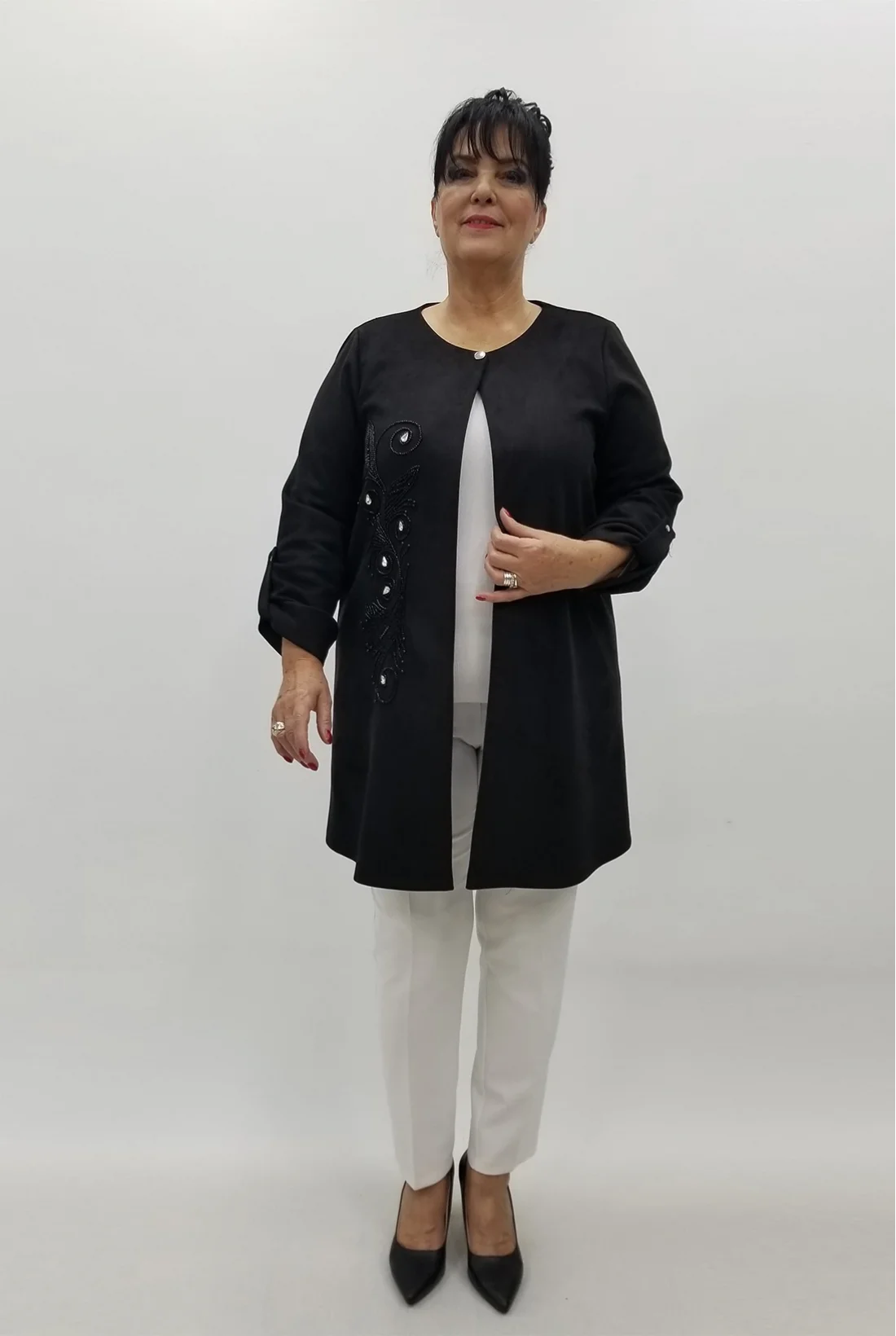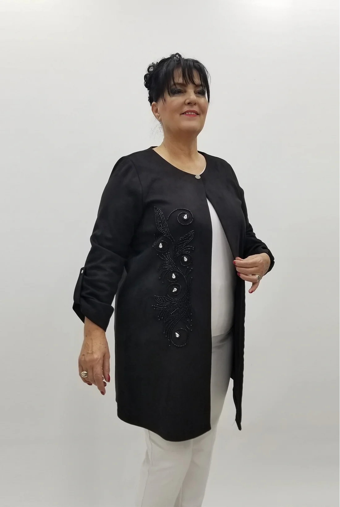Ön kısmı boncuk ve taşlarla işlenmiş, çıtçıtlı, kol katlamalı, likralı nubuk ceket (Tam kalıptır.)