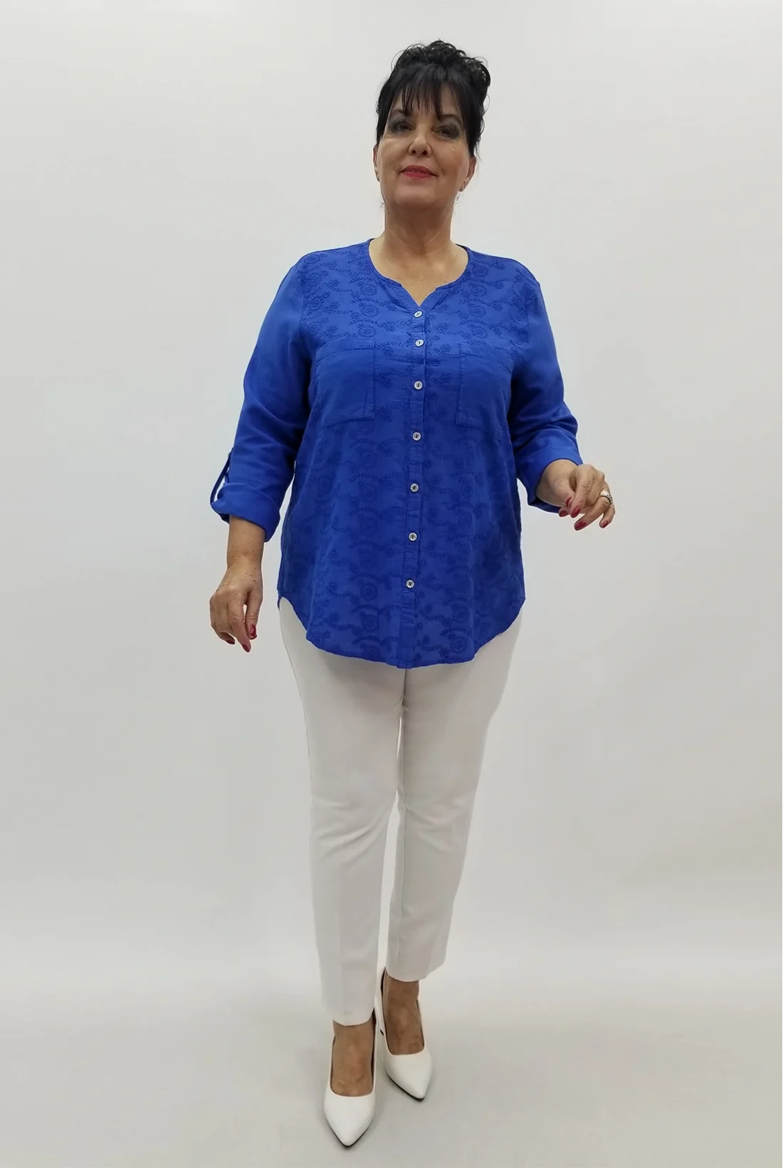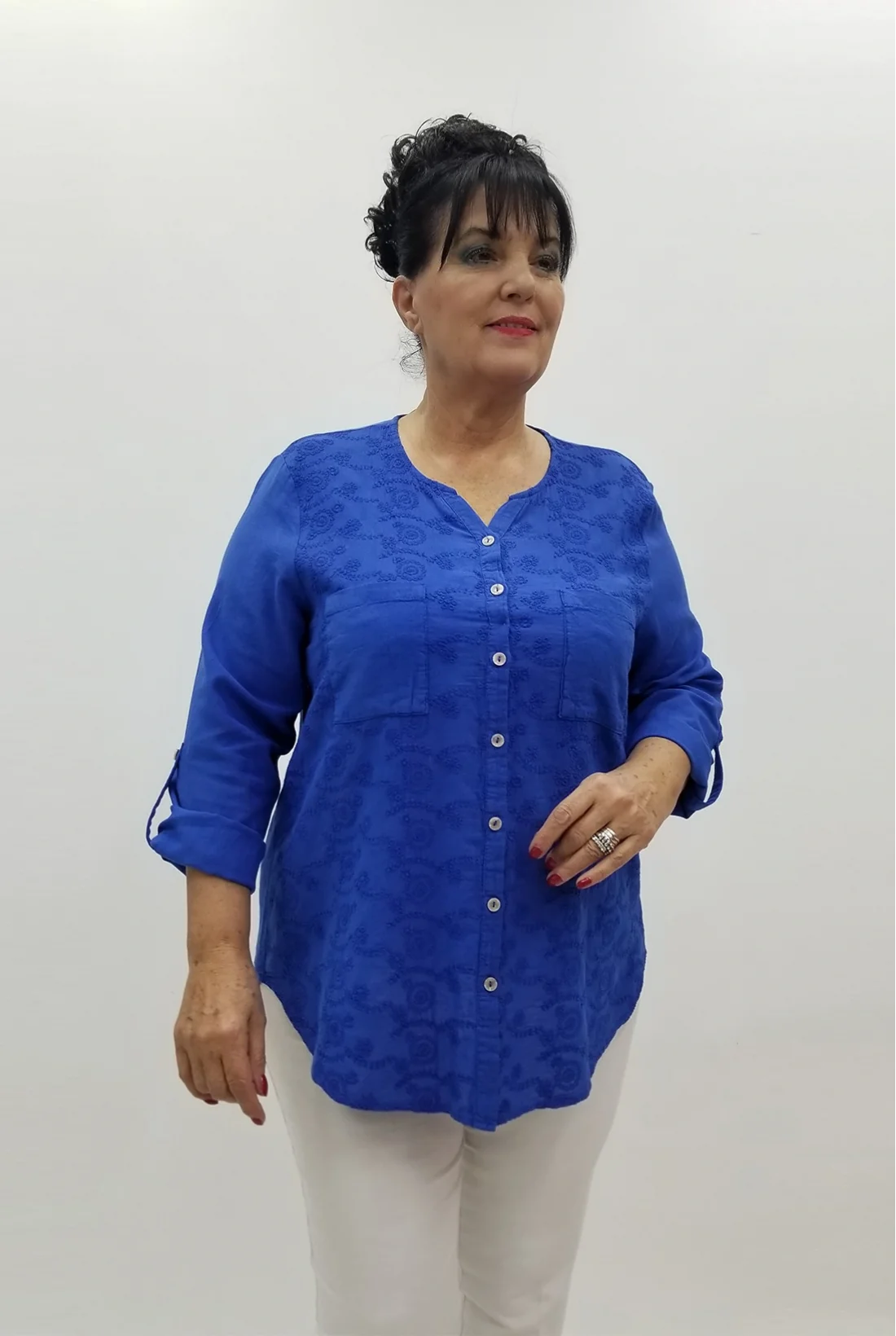 Ön kısmı nakışlarda işlenmiş ,cepli, kol katlamalı yıkamalı pamuklu dokuma gömlek &bluz (Tam kalıptır, likralı değildir.)