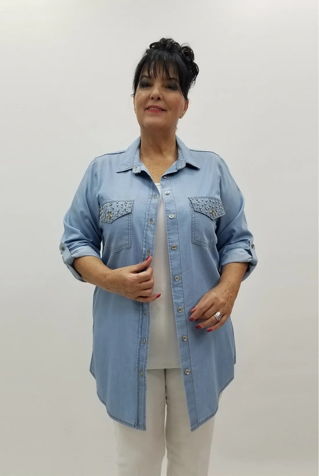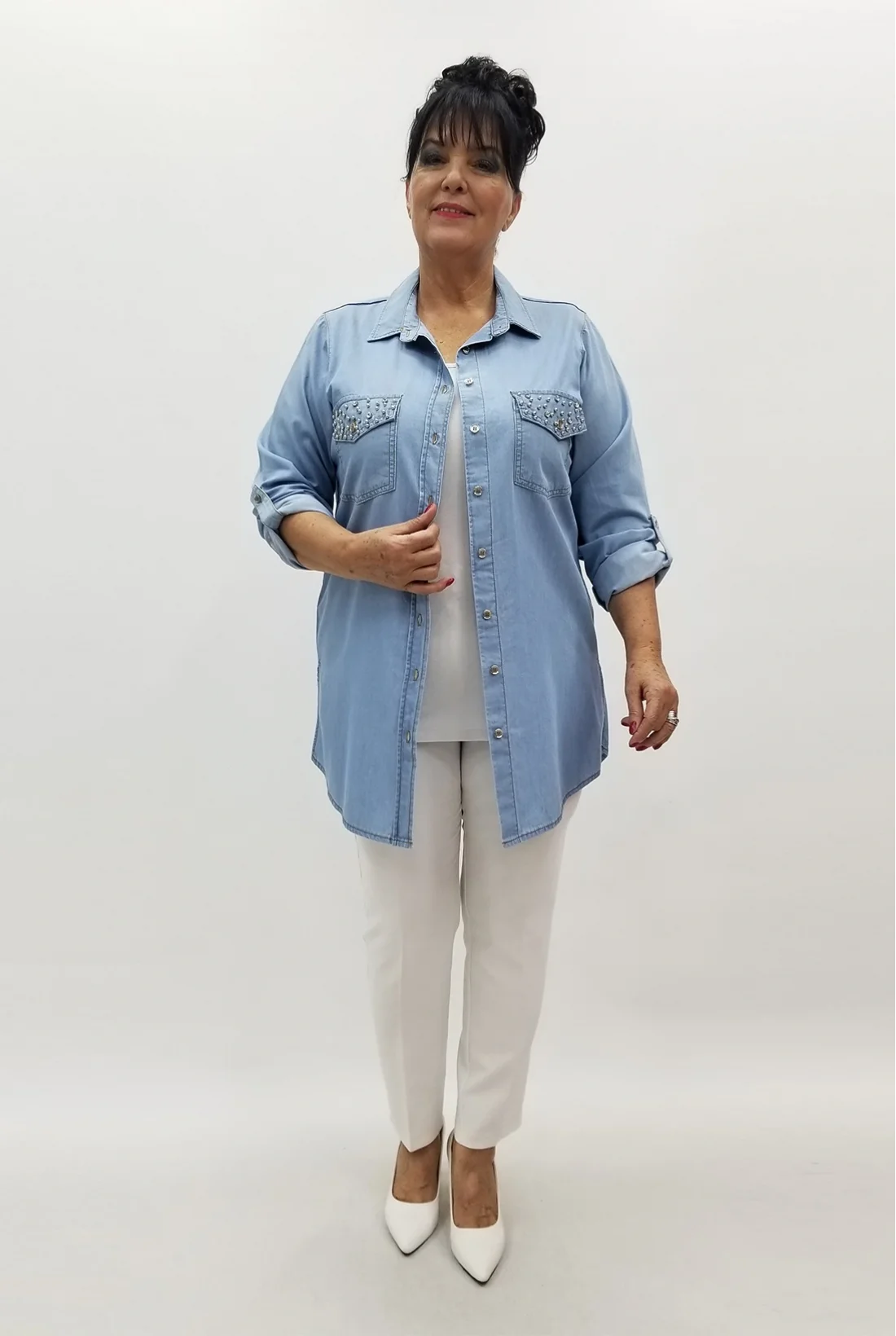 Kol katlamalı, cep kısmı taşlarla işlenmiş pamuklu dokuma kot tunik& gömlek (Tam kalıptır, likralı değildir.)