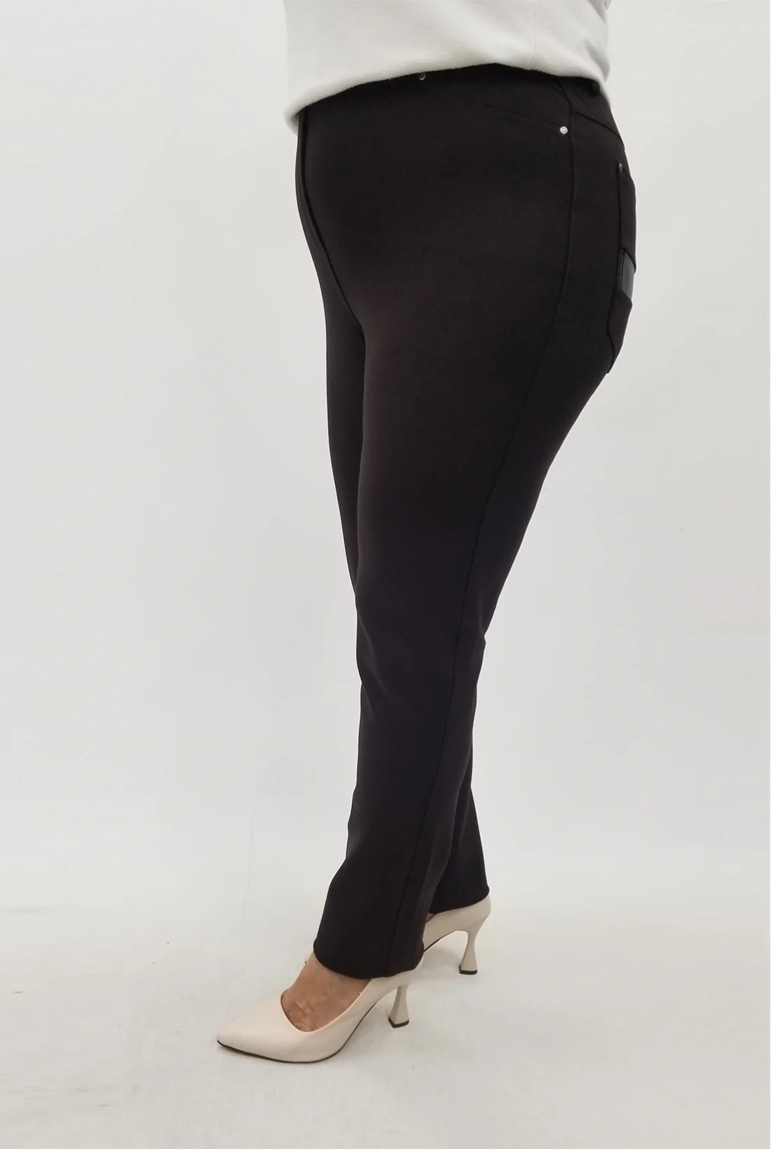 Toparlayıcı özellikli, yüksek bel, beli komple lastikli, kemerli, cepleri deri detaylı likralı çelik örme pantolon (Tam kalıptır.)
