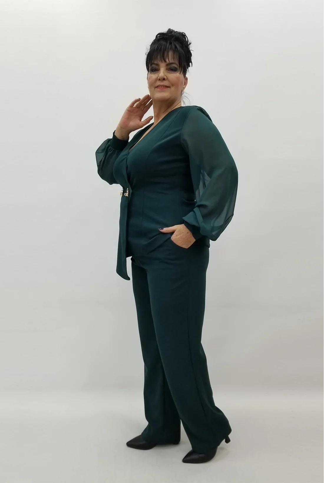 Likralı kruvaze yaka, kolları şifon kumaş bluzu ve altında cepli, yüksek bel, beli komple lastikli likralı pantolonuyla krep kumaş ikili takım. (Tam kalıptır.)