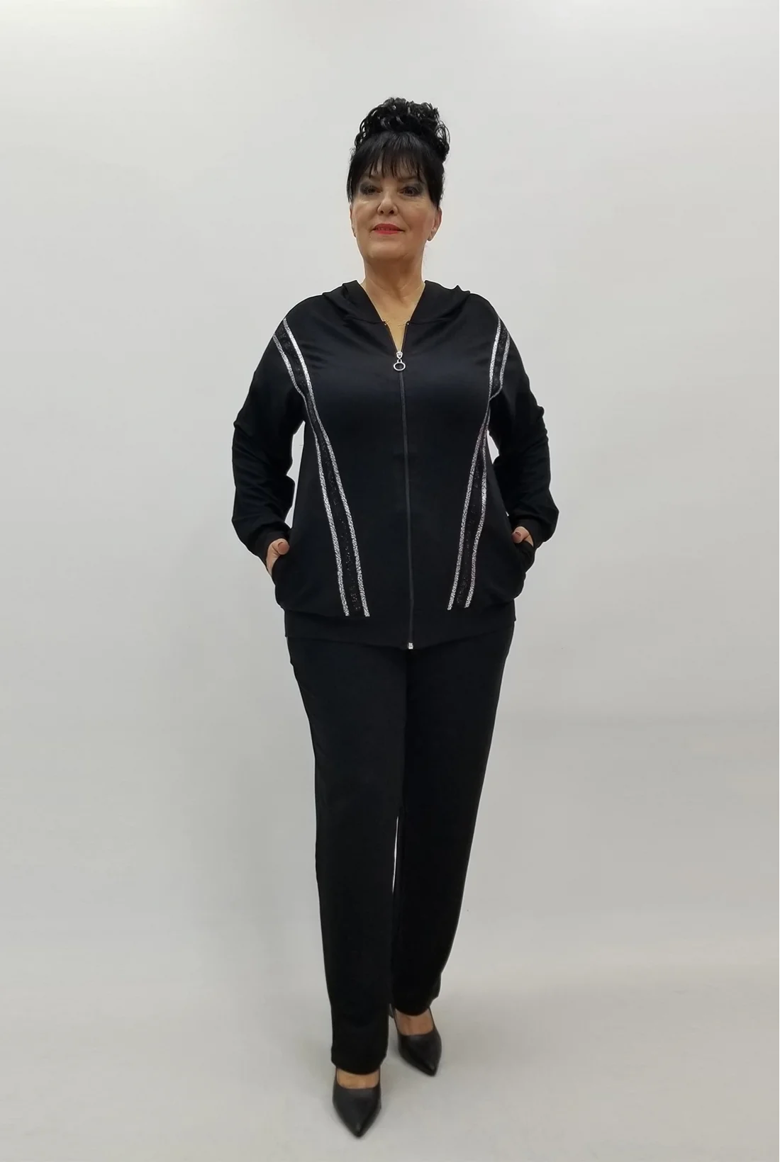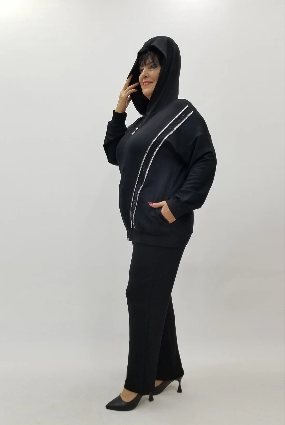 Kapüşonlu, cepli, fermuarlı ceketi ve altında yüksek bel, beli komple lastikli gümüş varak baskılı eşofman altıyla likralı (iki iplik) mevsimlik pamuklu dokuma eşofman takımı (Tam kalıptır.)