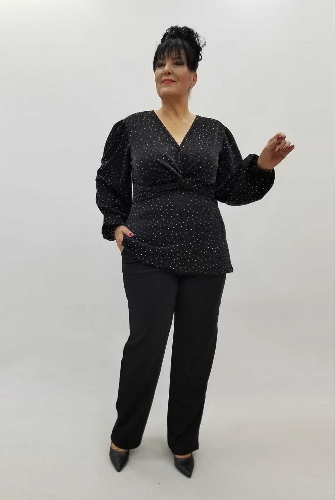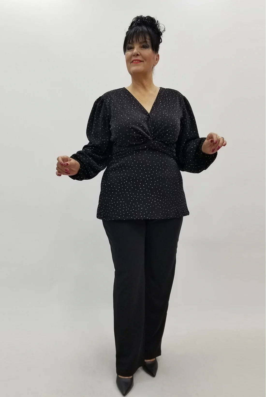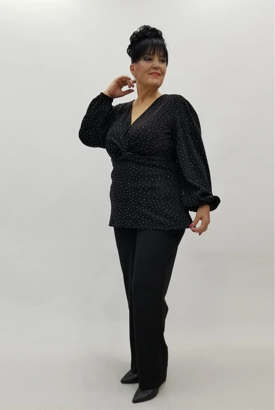 Kruvaze yaka, kol ucu lastikli likralı taşlı buzzy kumaş bluzu ve altında cepli, yüksek bel, beli komple lastikli likralı krep kumaş pantolonuyla ikili takım olarak satılmaktadır (Tam kalıptır.)