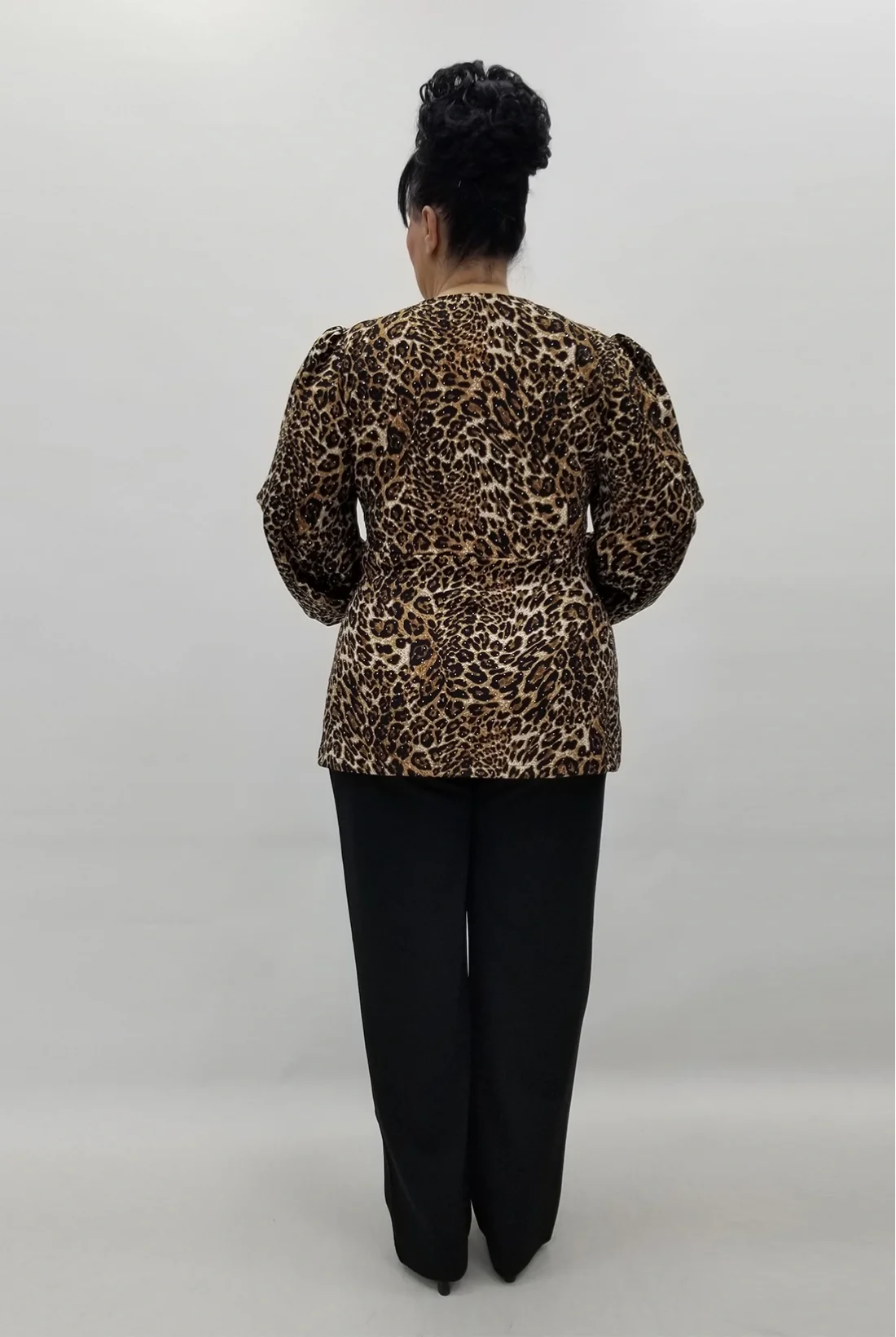 Likralı kruvaze yaka, kol ucu lastikli bluzu ve altında cepli, yüksek bel, beli komple lastikli likralı pantolonuyla krep kumaş ikili takım. (Tam kalıptır.)