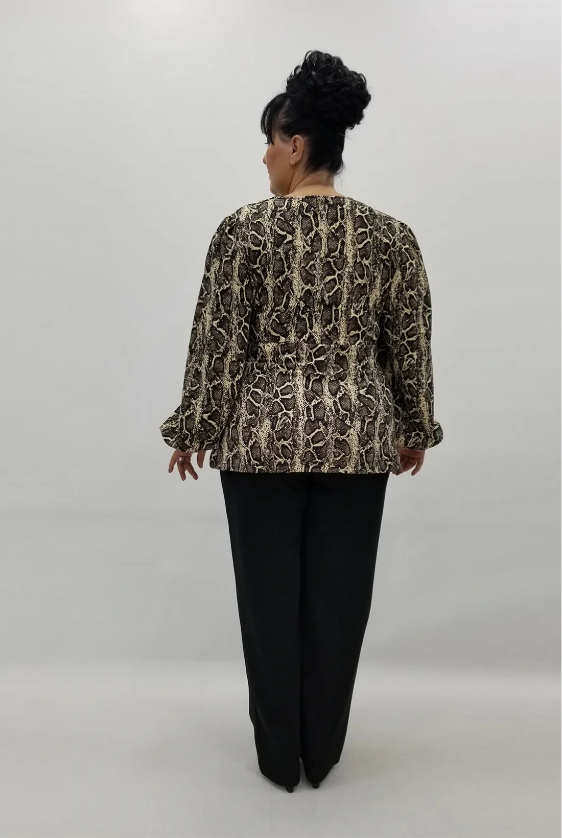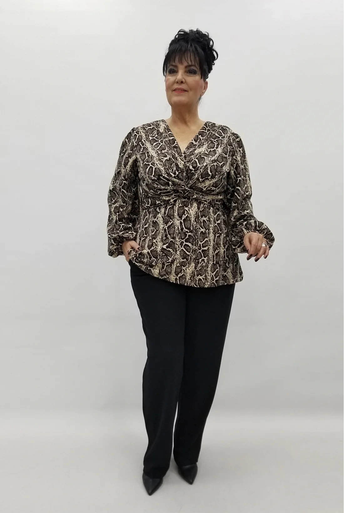 Likralı kruvaze yaka, kol ucu lastikli bluzu ve altında cepli, yüksek bel, beli komple lastikli likralı pantolonuyla krep kumaş ikili takım. (Tam kalıptır.)