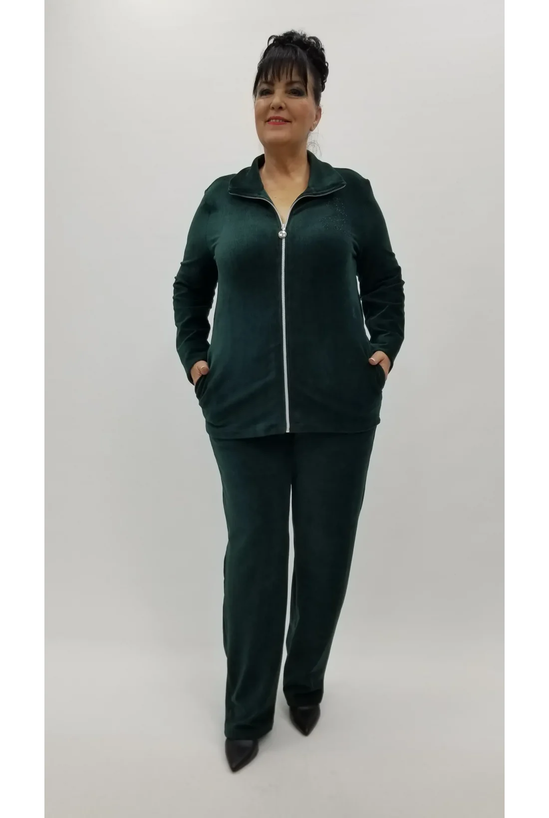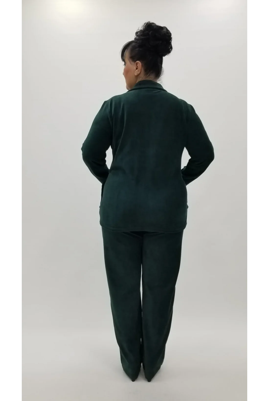 Yakası taşlarla işlenmiş cepli likralı ceketi ve altında yüksek bel, beli komple lastikli, cep kenarları taşlarla işlenmiş likralı pantolon altıyla fitilli kadife ikili takım . (Tam kalıptır.)