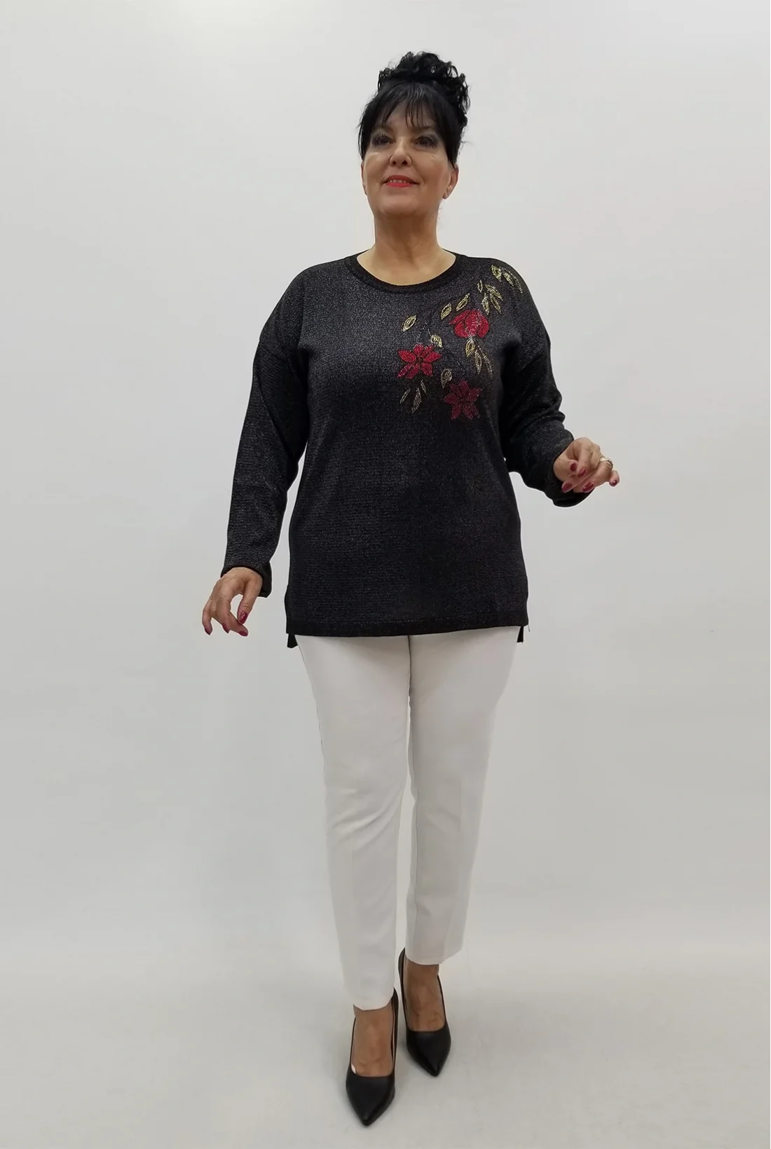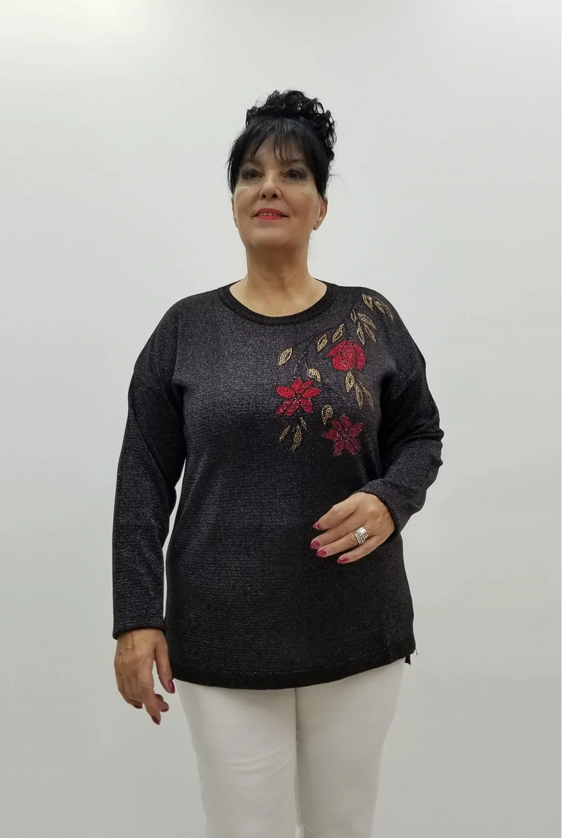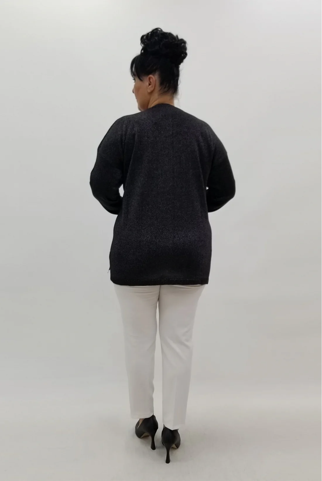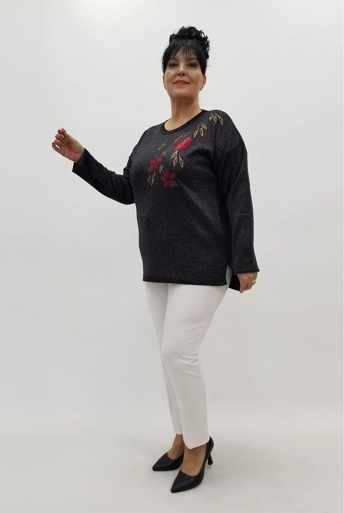 Yandan yırtmaçlı simli likralı triko bluz (Tam kalıptır.)