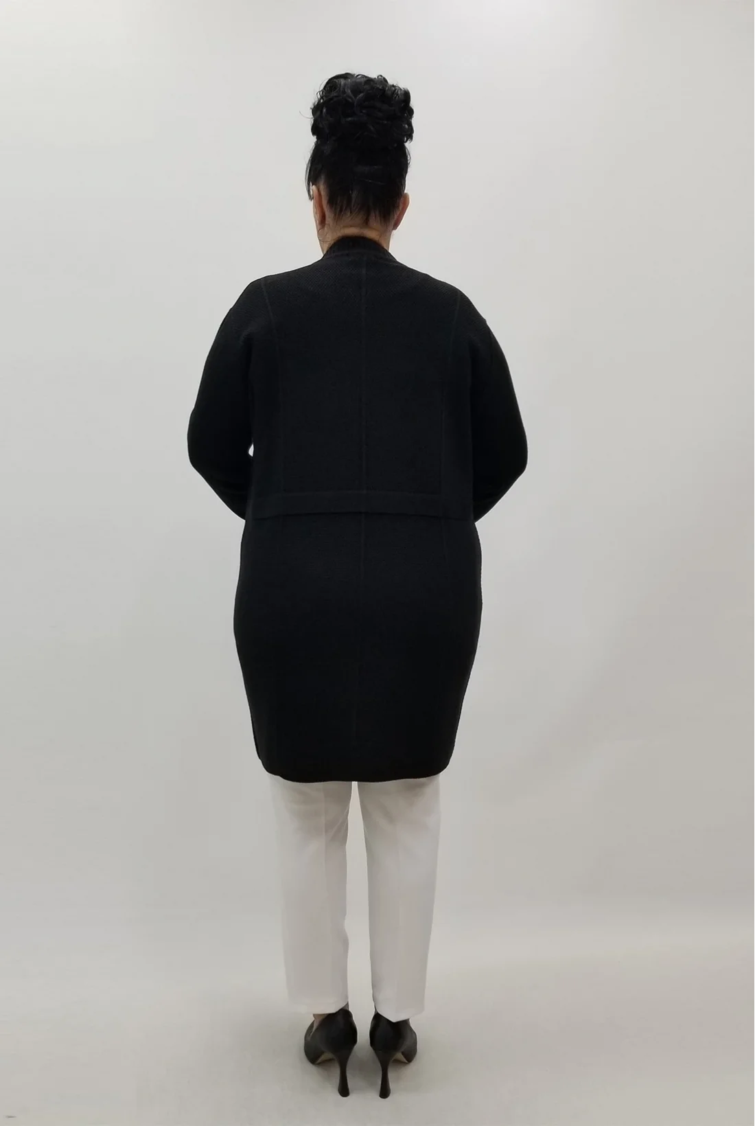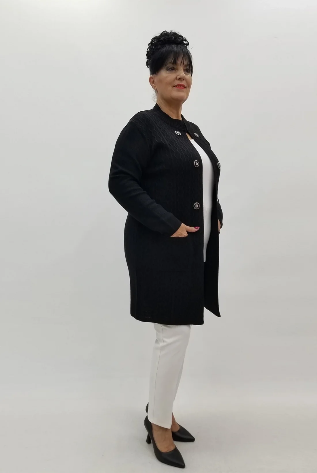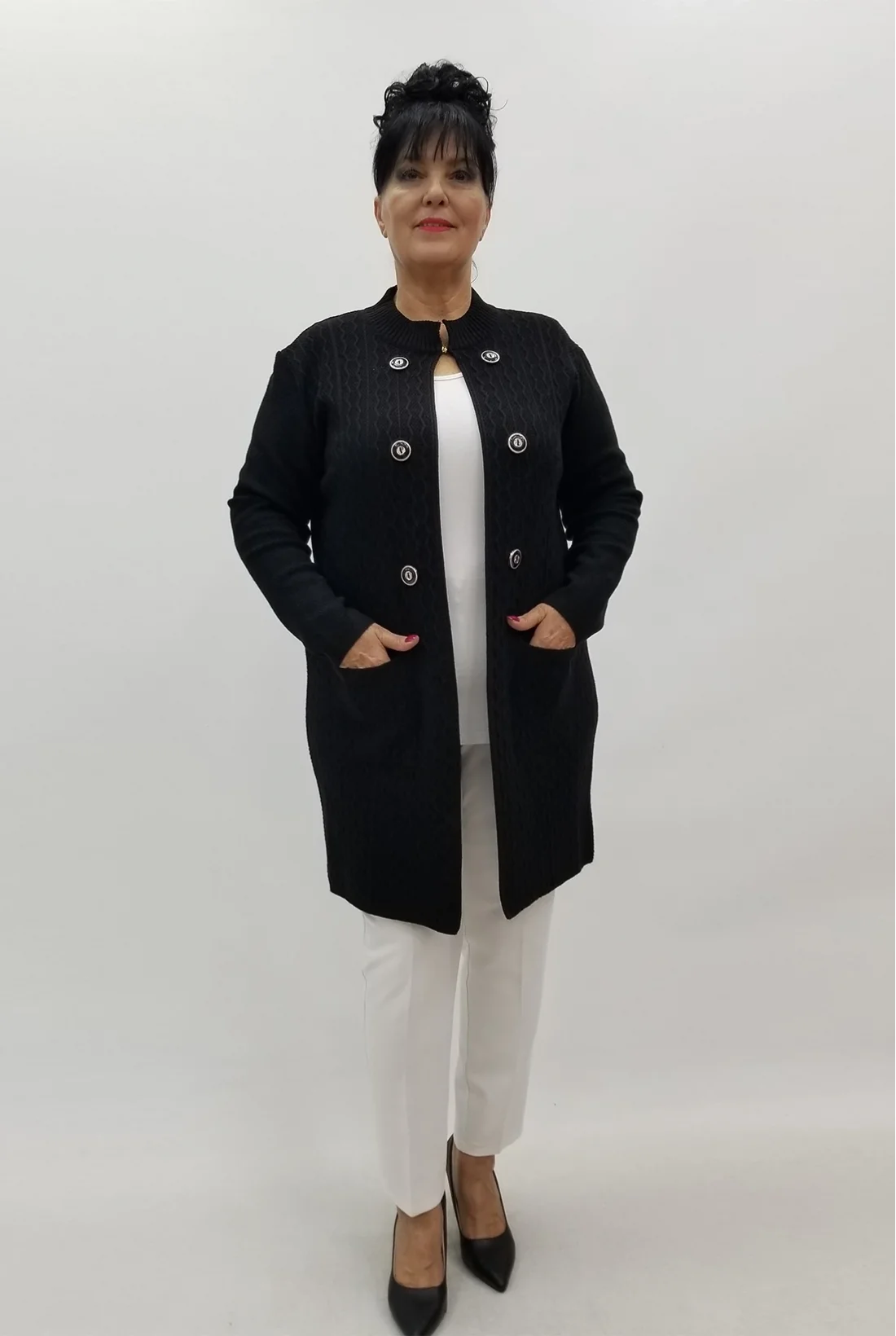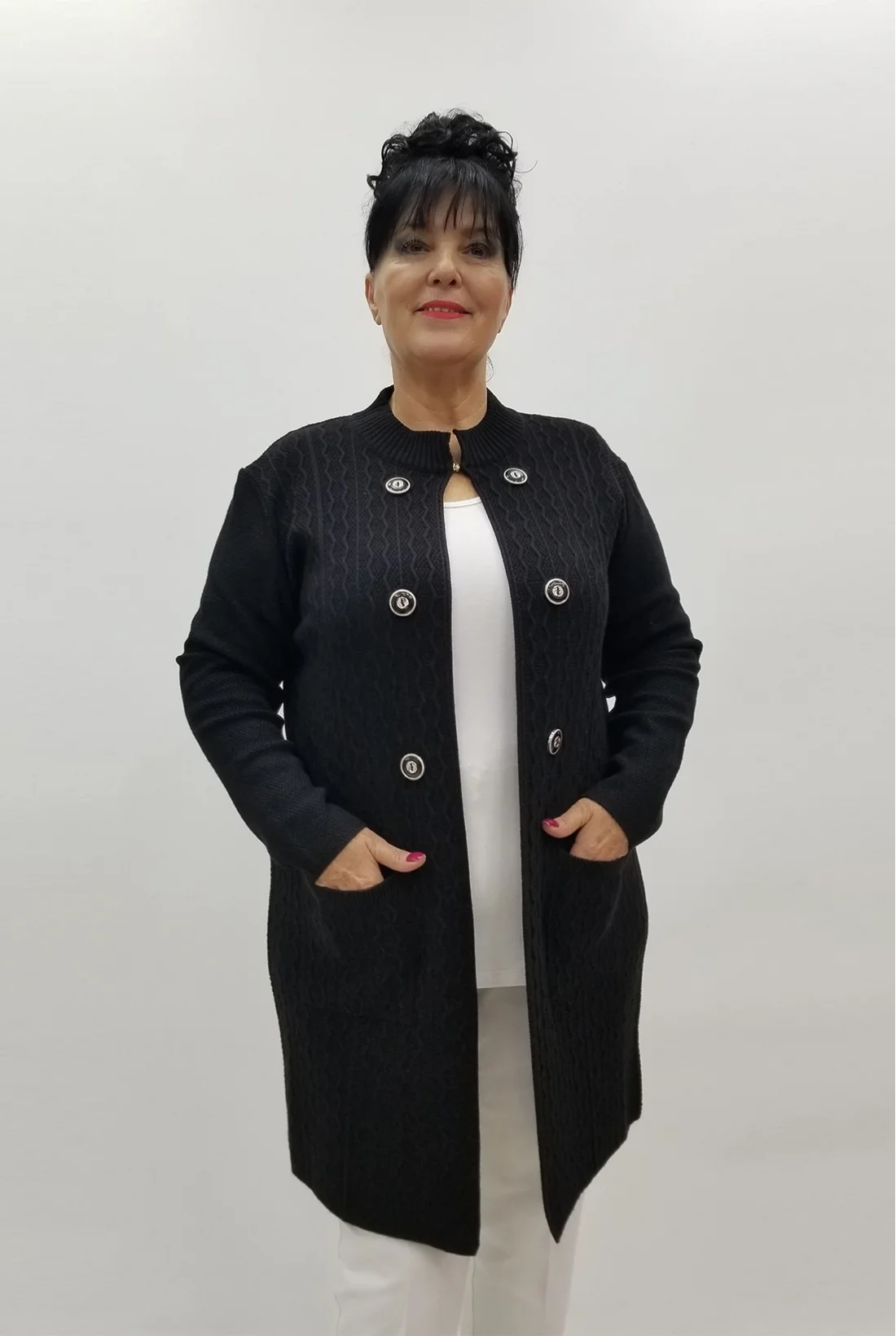 Yakası kopça detaylı, düğmeli görünümlü cepli, likralı triko ceket&hırka (Tam kalıptır.)
