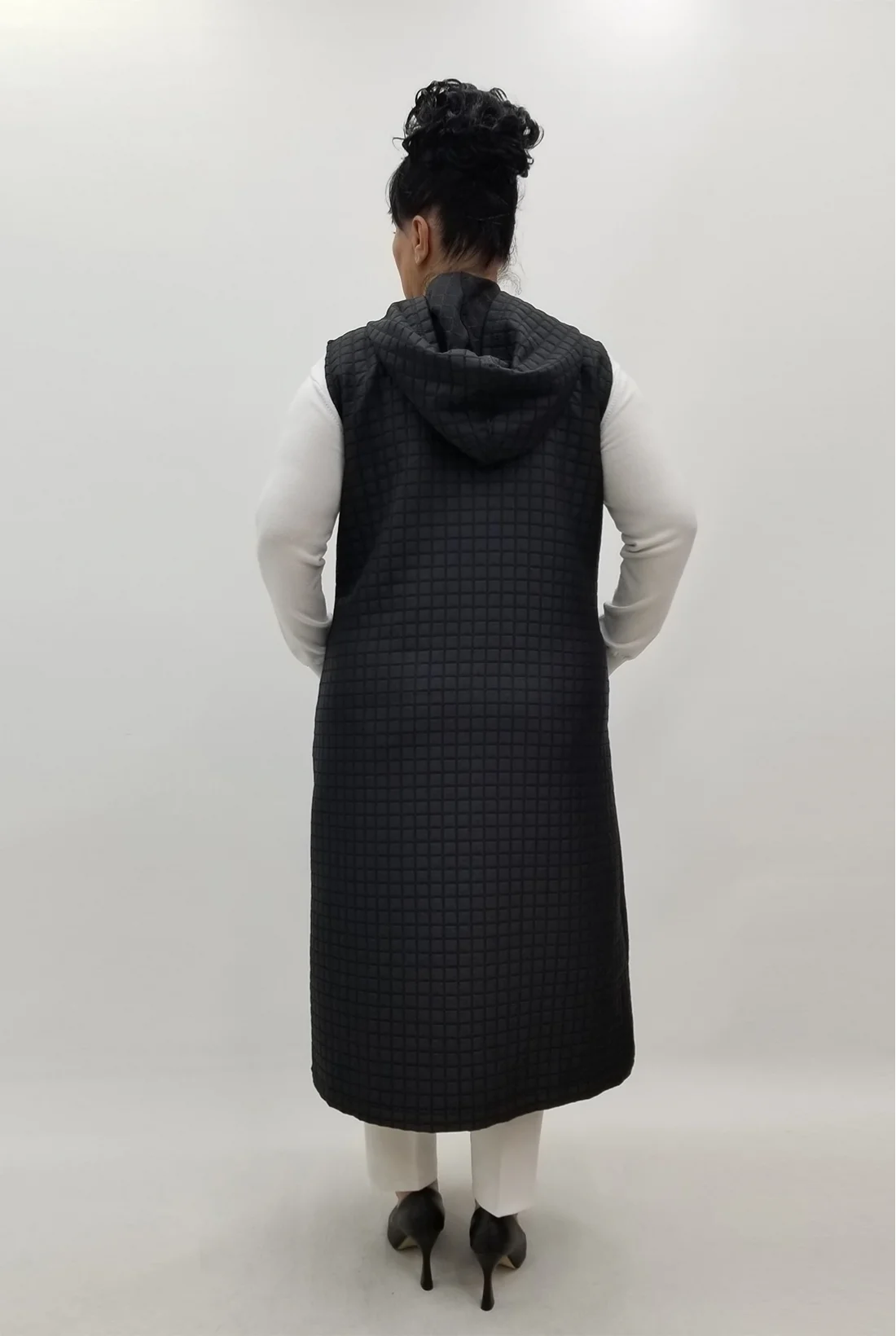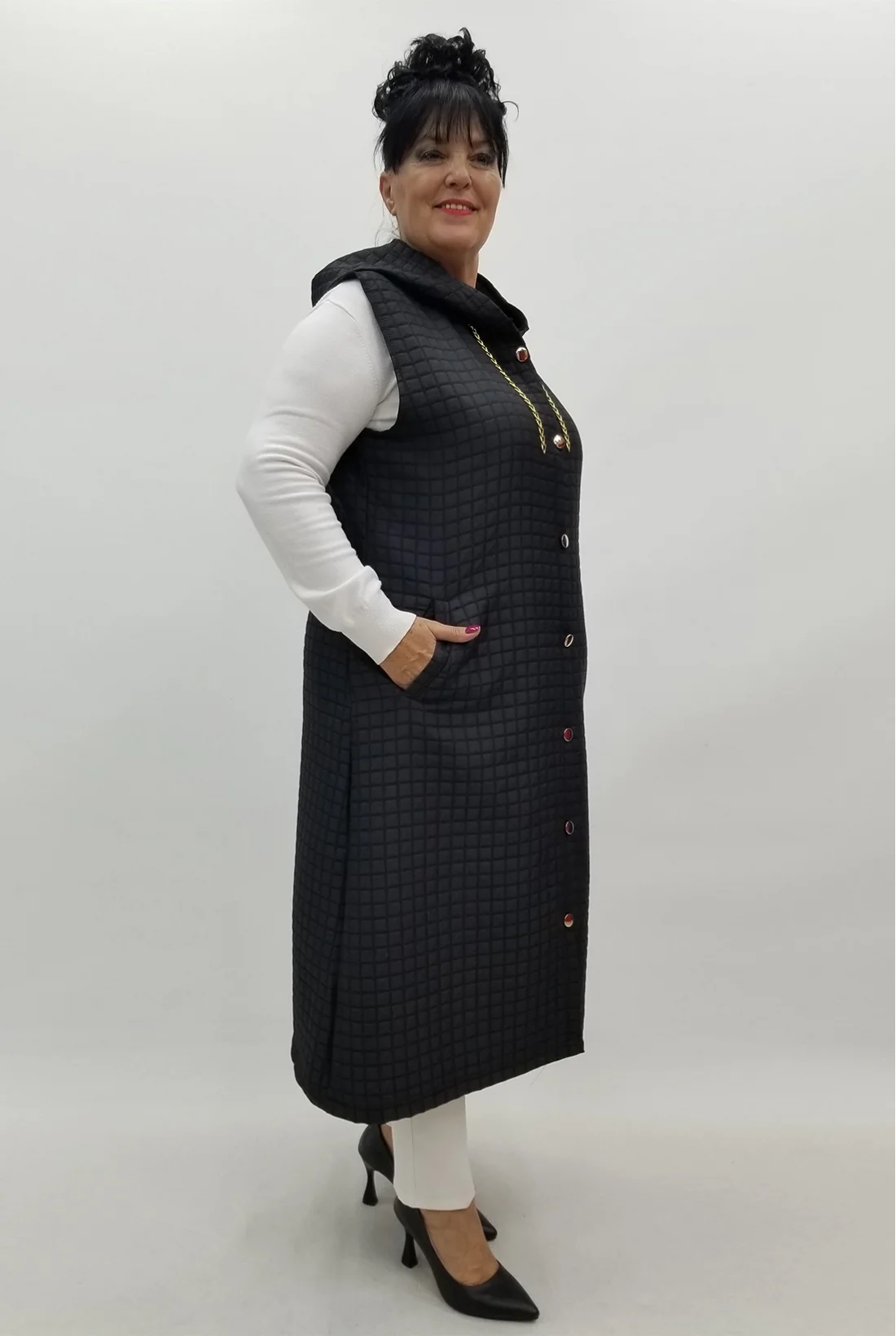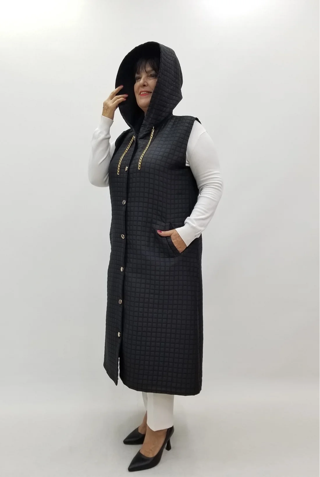 Kapüşonlu, düğmeli, cepli  kapitone yelek ( Tam kalıptır , likralı değildir, kapüşonu sabittir.)